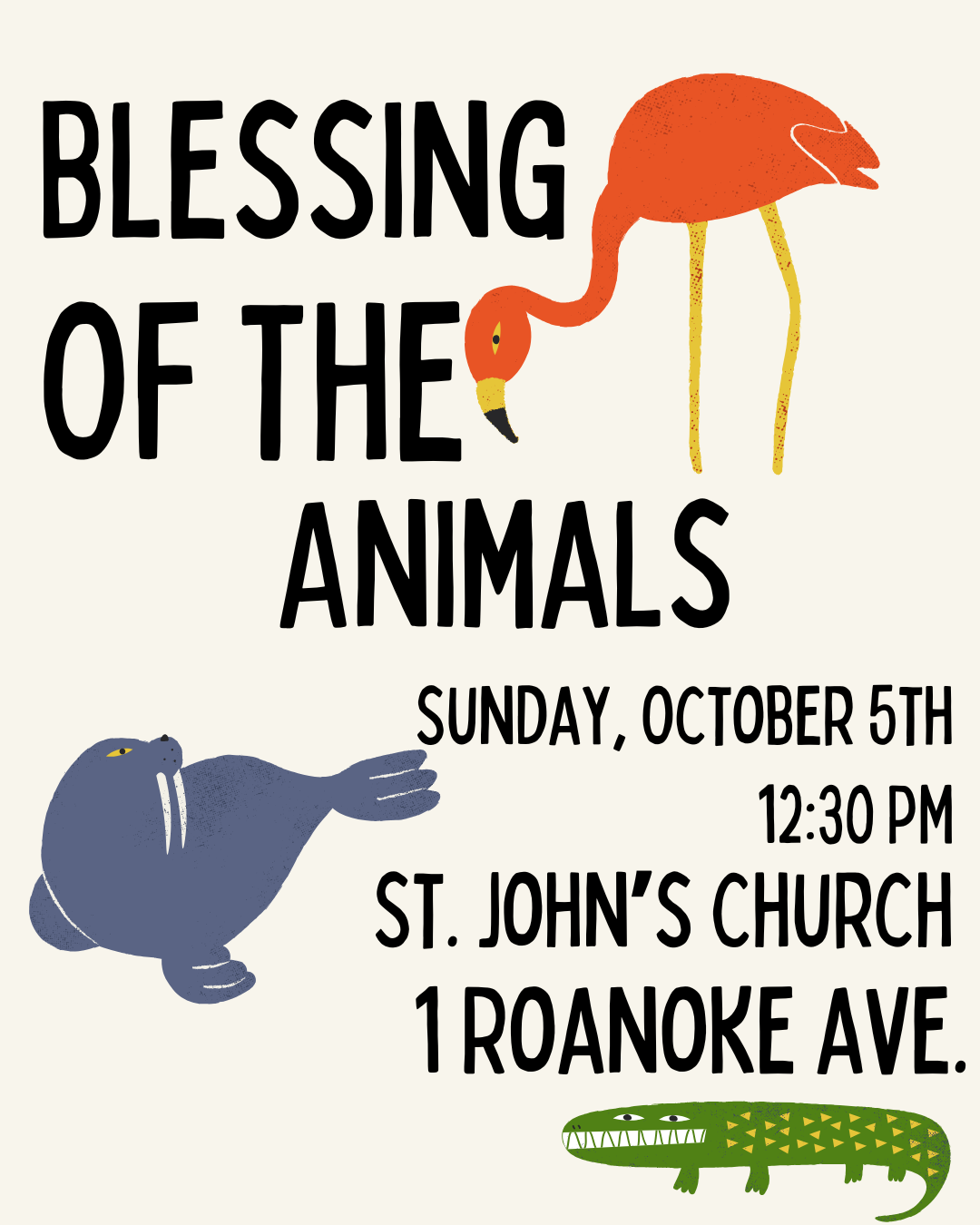 Join us for our annual Blessing of the Animals on Sunday, October 5th! We’ll gather on the front lawn and bless all pets, stuffies, pictures of pets, favorite pet toys, and more. All are welcome, no exceptions!